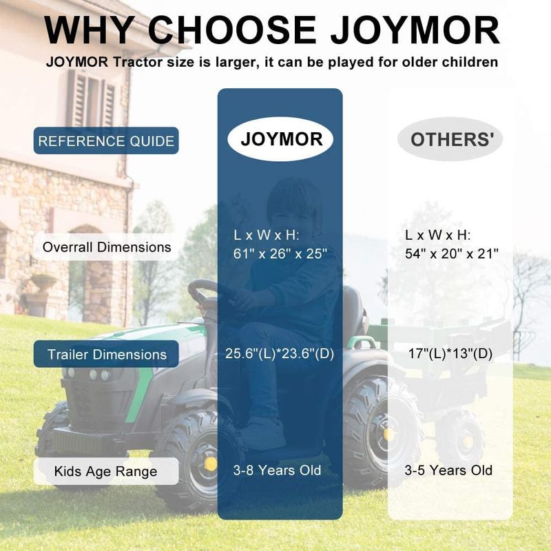 Material e tamanho de atualização feito de plástico de qualidade para o corpo e tem todos os eixos de metal. Ao contrário de outros, use plástico em toda a direção, que eventualmente quebra e também torna a direção mais difícil e menos precisa. ons na eram muito pequenos. Mas o trator JOYMOR tem grande potência e é um tamanho grande o suficiente para seus filhos crescerem.