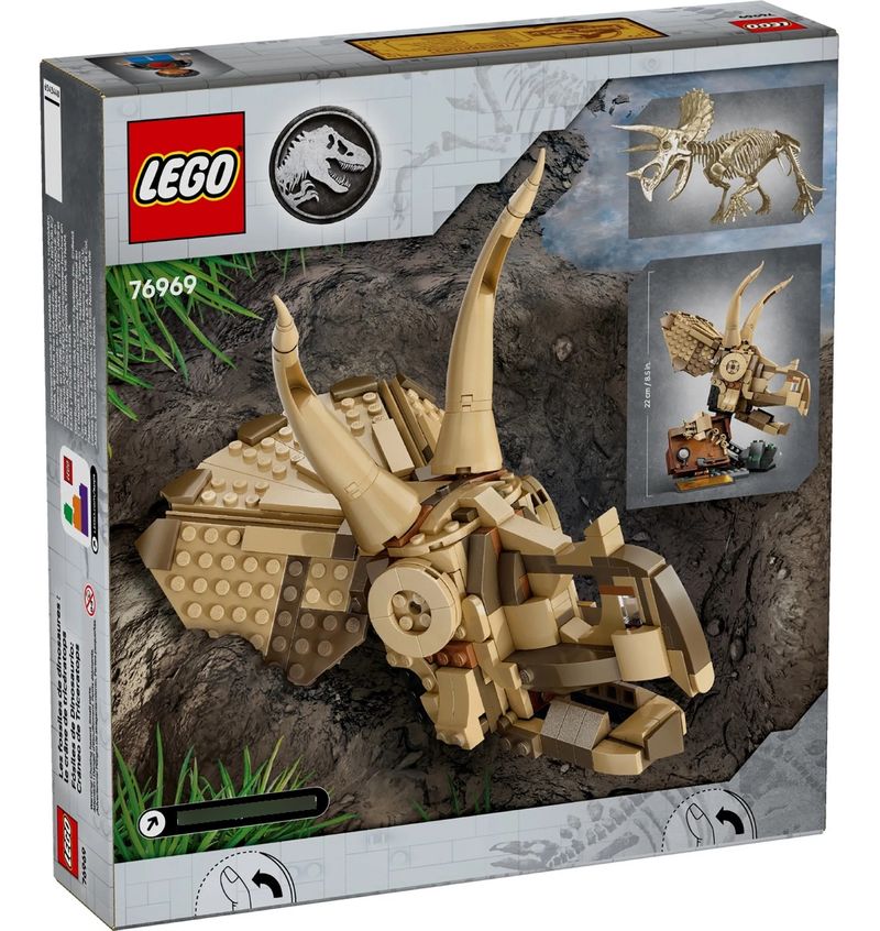 Este modelo de conjunto de brinquedos da série de exibição Fósseis de Dinossauros apresenta um crânio de Triceratops com uma mandíbula que abre, um suporte com uma base de pedra, uma placa de local de escavação com minifósseis e ferramentas de escavação, uma minifigura LEGO, uma placa de informações e uma peça "âmbar" com um mosquito envolto.