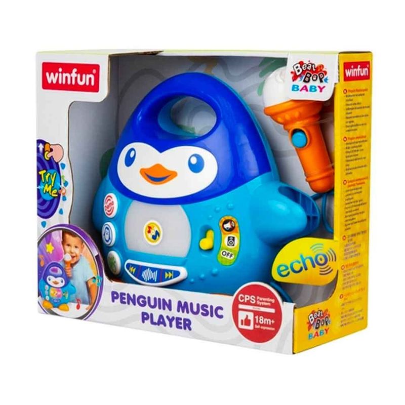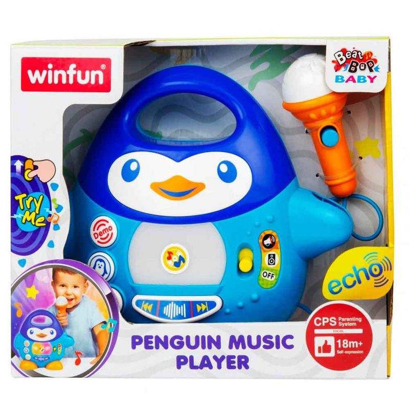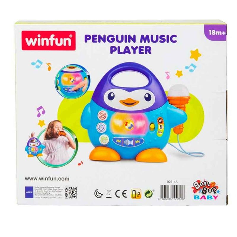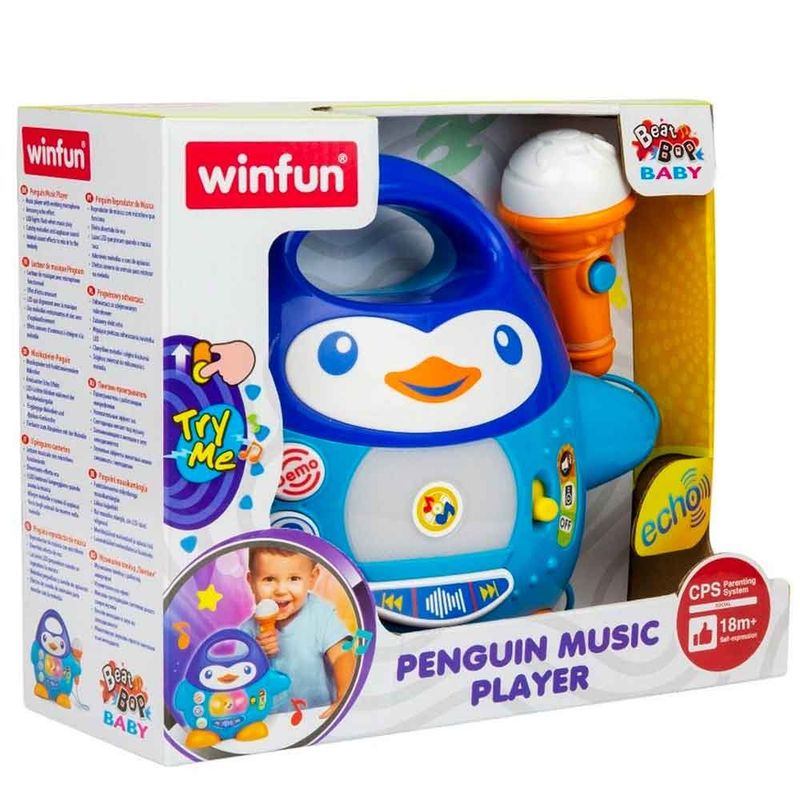 Seu pequeno vai dar um show com esse microfone infantil Pinguim Musical Winfun. O brinquedo é um reprodutor de músicas com microfone que funciona de verdade. Possui efeito de eco e luzes que piscam enquanto a música toca. O efeito de eco deixa a brincadeira mais divertida e interessante. Também possui sons de aplauso, sons de animais que podem ser mesclados com as melodias pré-programadas. Nos botões de função pode-se avançar as músicas e tocá-las ao contrário.