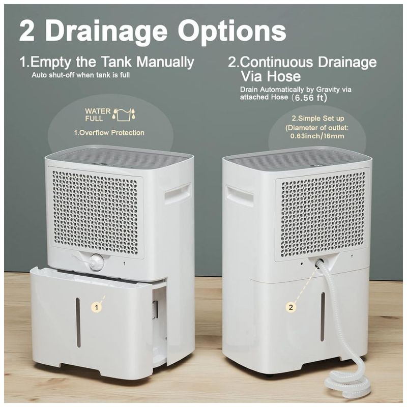 OPERAÇÃO FÁCIL Ele irá rodar e desligar automaticamente quando chegar ao ponto. 2 opções de drenagem para suas opções de drenagem Drenagem automática com mangueira de drenagem de 2 m 6,56 pés incluída para drenagem automática contínua do desumidificador sem esvaziar o balde de água. Drenagem manual O indicador de tanque de água e balde cheio de 0,6 galões permite que você saiba quando o balde de água precisa ser esvaziado. Função de degelo automático pode detectar a necessidade de degelo e processar o degelo automaticamente