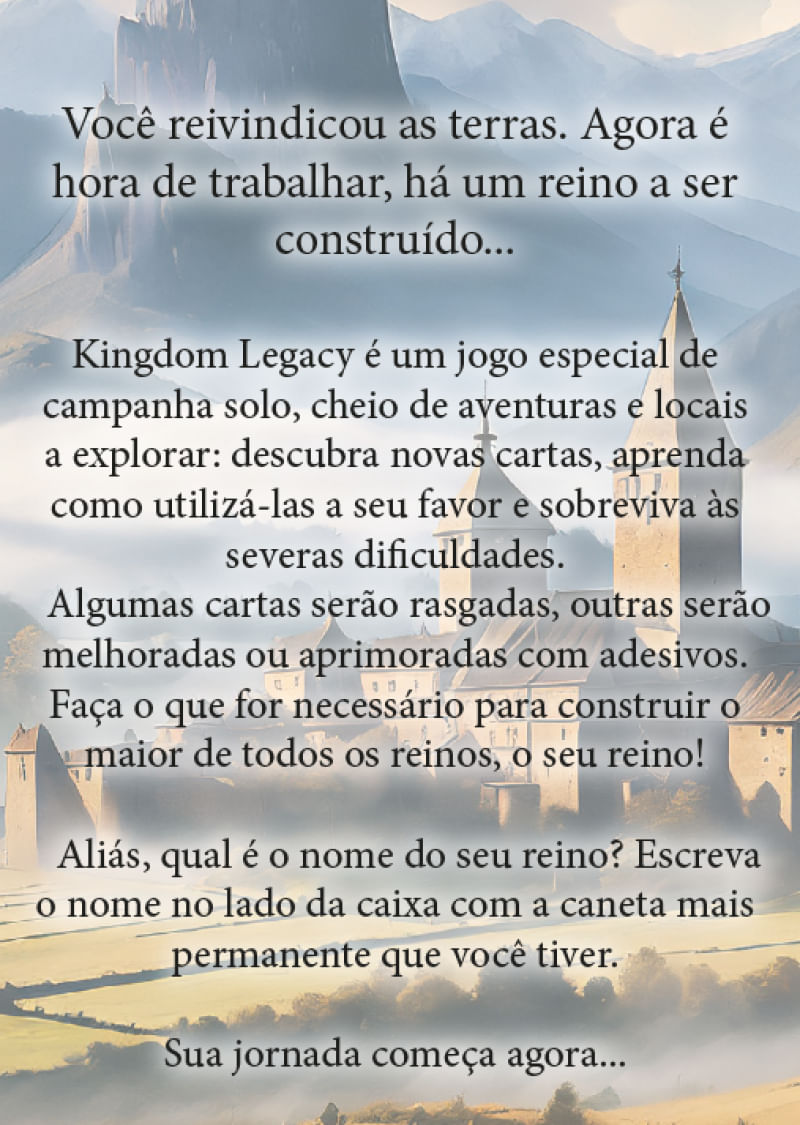 Kingdom Legacy – Reino Feudal é um jogo solo, de construção de reinos, em que o jogador desenvolve seu território por meio de cartas ao longo de uma partida. A mecânica principal gira em torno da rotação ou virar das cartas, o que representa a evolução de construções, territórios e eventos. O jogo é progressivo: você começa com um baralho inicial de 10 cartas e, a cada rodada, descobre novas cartas, que trazem novos elementos e desafios ao seu reino.