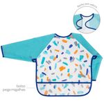 O Avental/Babador com Mangas da Buba possui tecido impermeavel e bolso pega migalhas,