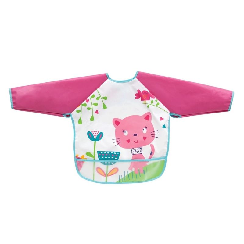 O Avental/Babador com Mangas da Buba possui tecido impermeavel e bolso pega migalhas,