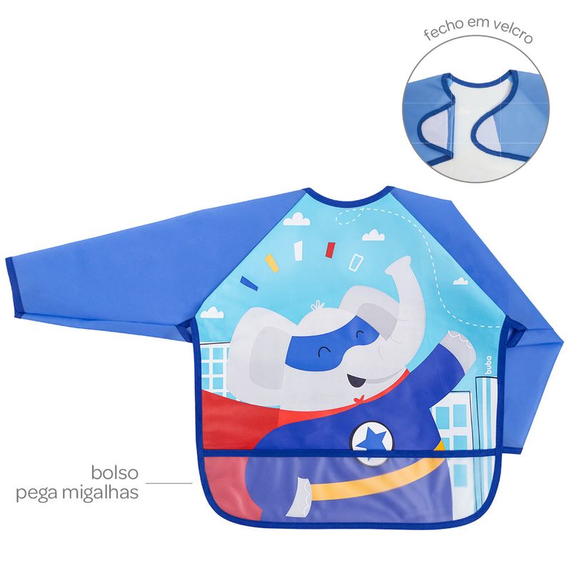 O Avental/Babador com Mangas da Buba possui tecido impermeavel e bolso pega migalhas,