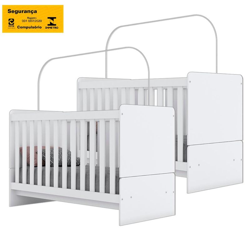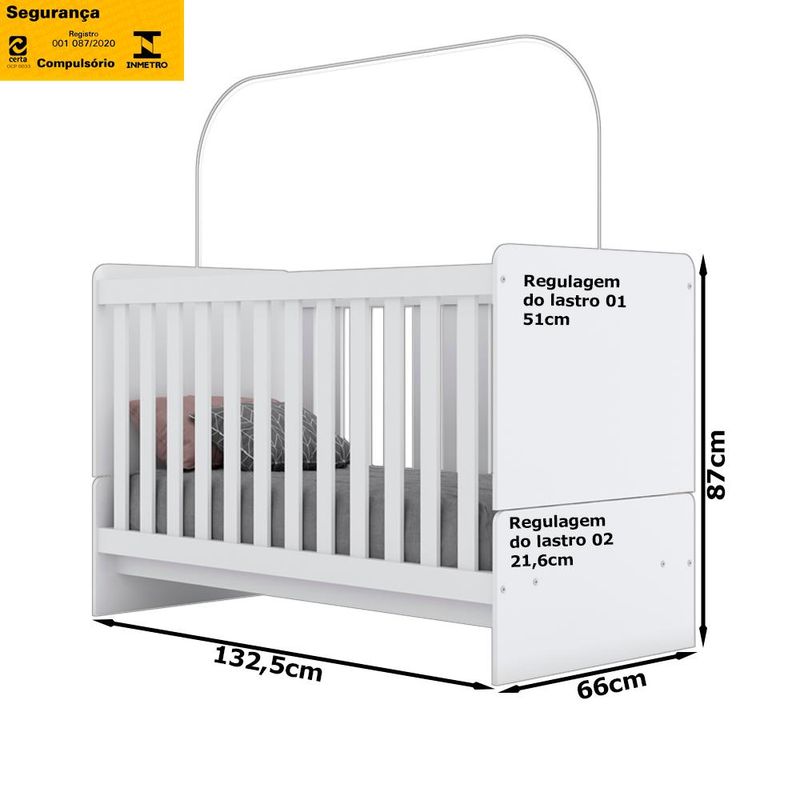 Kit 2 Berço Mini Cama Labirinto, Certificado pelo INMETRO Nº 001 087/2020, possibilita 02 formas de uso para acompanhar o crescimento da criança, estrutura resistente em MDF de 25, 15 e 12 mm e MDP de 15 mm, acabamento em pintura UV/PU (Brilho e Fosco). Ideal para colchão medindo 130 X 60 cm (Colchão Não Incluso), estrado resistente com regulagem de altura sendo a Regulagem Alta 51 cm do chão e a Regulagem Baixa 21,6 cm do chão, grades fixas, contém suporte para mosquiteiro, suporta até 25 Kg, este berço irá oferecer charme e estilo. Estes móveis chegaram a sua casa separados em 02 volumes.