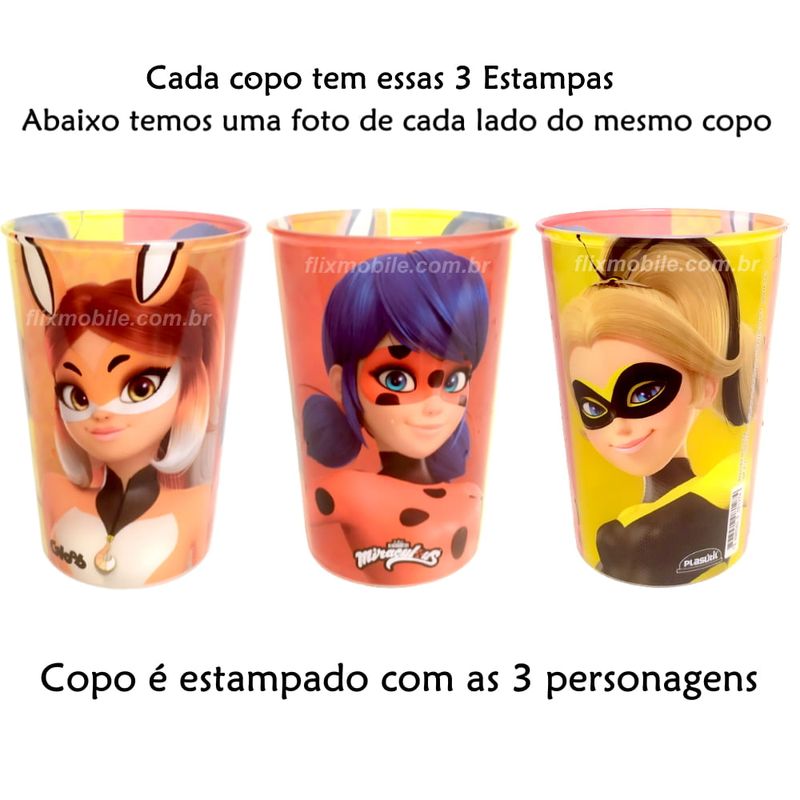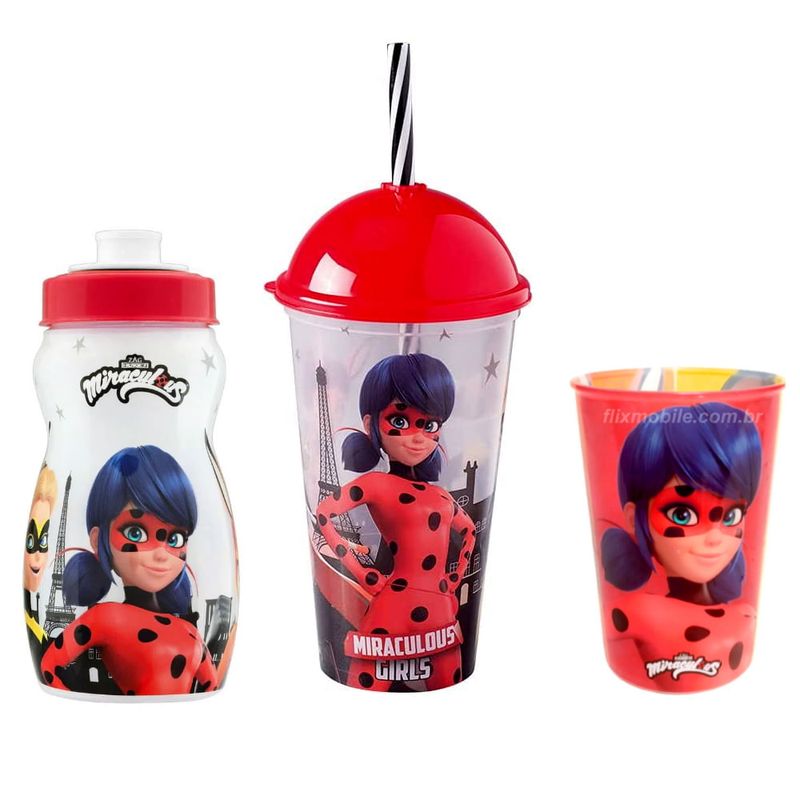 Kit Copos e Garrafinha do Miraculous Ladybug com Estampa de 3 Personagens Plasútil