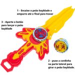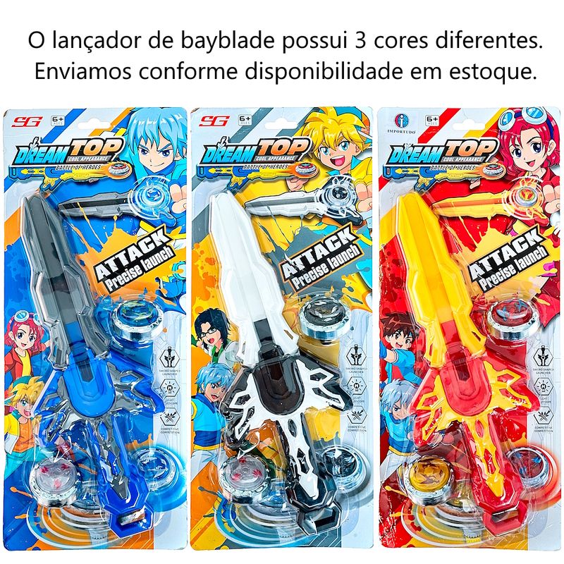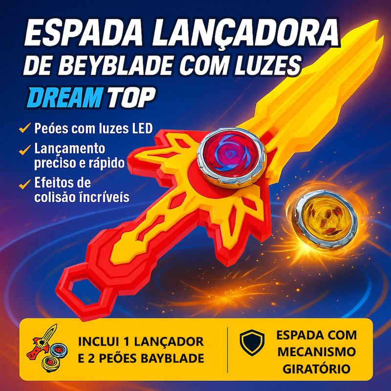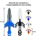 Kit com 2 espada lançadora e 4 peões com luzes LED. Mecanismo giratório para lançamento preciso e rápido com design resistente, ideal para duelos e competições entre amigos. Fácil de usar: encaixe o peão, acione o lançador e batalhe. Ótima opção de presente para as crianças.