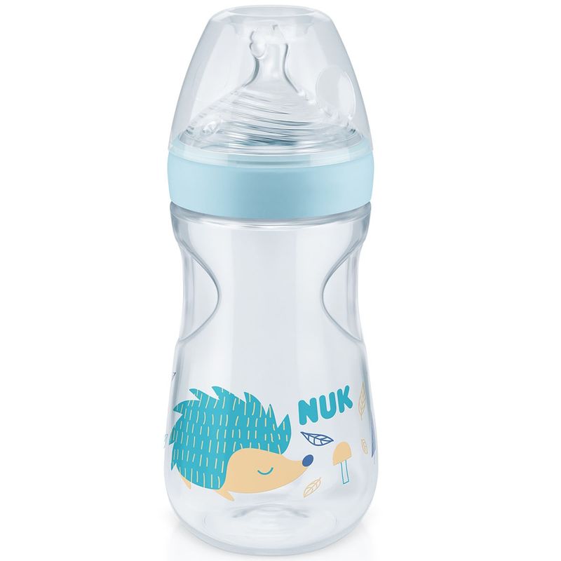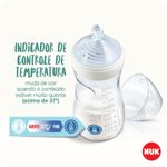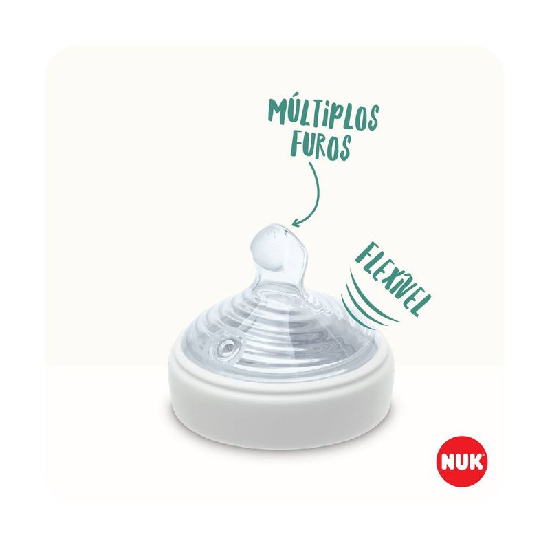 Produzido em silicone macio extra flexível. Sua válvula NUK Air System Anticólica reduz a formação e ingestão de bolhas de ar durante a alimentação, proporcionando maior conforto para o bebê. Seu frasco ergonômico e com design mais acinturado, em formato anatômico, é super-resistente e facilita a pega oferecendo maior conforto para a criança durante a alimentação.  O novo indicador de controle de temperatura possui a sinalização do termômetro, localizada próximo à escala de graduação do frasco, que ajuda os pais na tarefa de assegurar a temperatura adequada dos alimentos para o consumo seguro das crianças.  Se o conteúdo estiver muito quente, acima de 37ºC, o botão de temperatura ficará branco, sendo necessário aguardar até retornar à cor azul para oferecer a mamadeira ao bebê.
