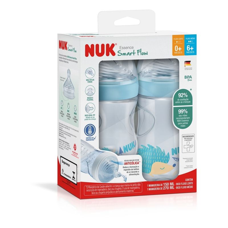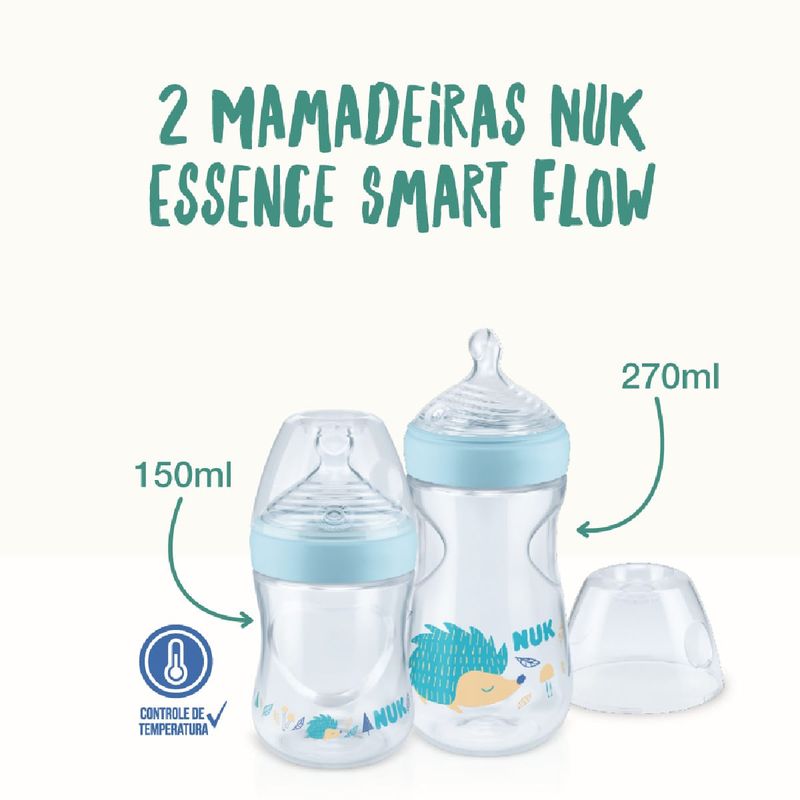 Kit 2 Mamadeiras Smart Flow 150/270ml Azul Essence NUK O Kit com duas Mamadeiras  Anticólica NUK Essence Smart Flow possui bico com tecnologia inovadora composta por sistema de fluxo de líquidos com múltiplos furos, que variam em quantidade, para garantir a saída adequada de líquido conforme a consistência de cada alimento.