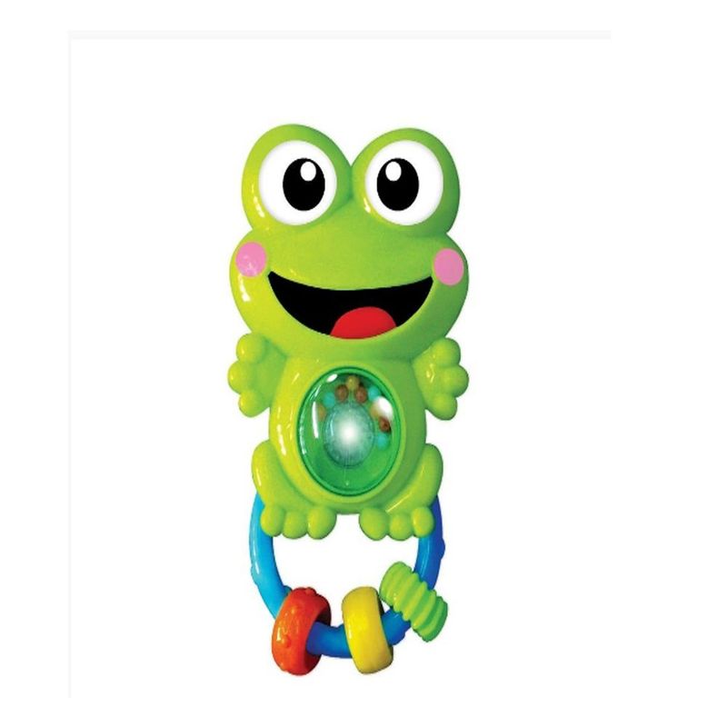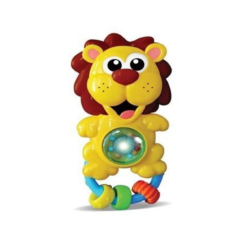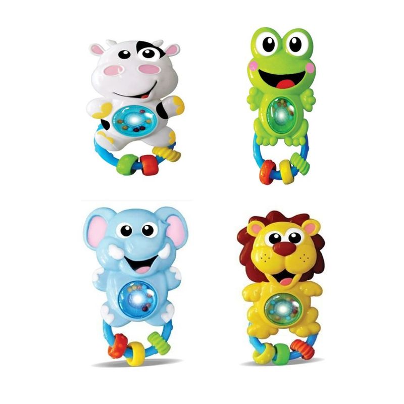Amigo Chocalho Ao movimentar a argola azul ascenderão luzes na barriga acompanhando os sons emitidos.São sete sons diferentes que tocam quando a alça é movimentada.Possuem bolinhas e pequenas argolas que se mexem e fazem barulho conforme o bebê brinca com o chocalho.São 4 modelinhos diferentes, vaquinha, sapinho, elefantinho e leãozinho.