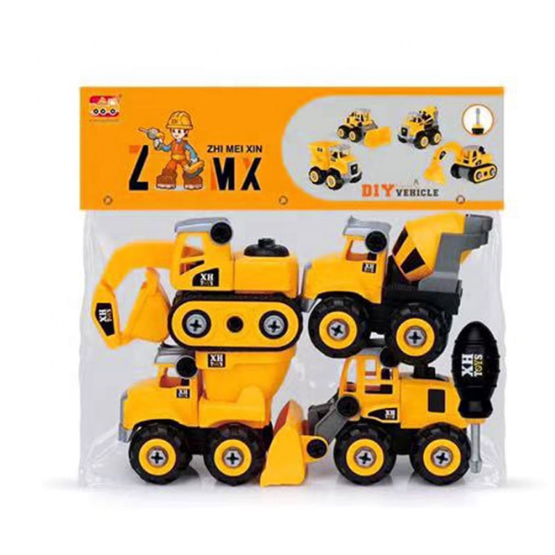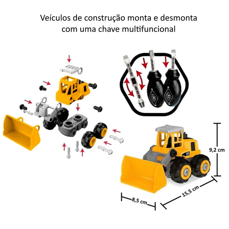 As crianças vão amar este brinquedo de montar. Além de ser um ótimo entretenimento, ajuda no desenvolvimento da coordenação motora e estimula a resolução de lógica nas crianças. Conta com 4 modelos de veículos de construção diferentes e uma chave multi funcional philips/fenda. Fabricado com ótimos materiais e cheios de detalhes, são super resistentes para a brincadeira durar ainda mais.