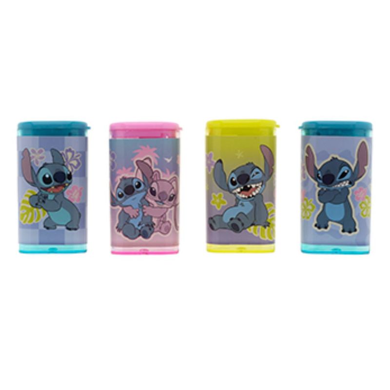 Apontador com Depósito Escolar Stitch, possui 4 estampas divertidas, além de ser prático e com excelente qualidade.