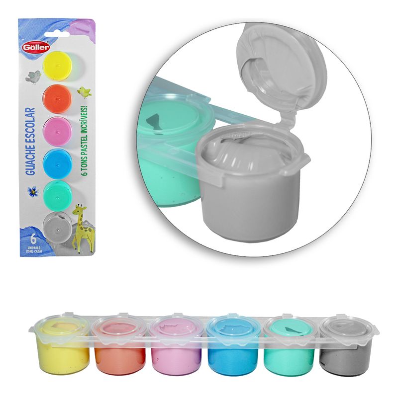 TINTA GUACHE ESCOLAR COM 6 CORES PASTEIS 15MLcapacidade:15MLINDICAÇÃO: MAIORES DE 3 ANOSTAMANHO APROXIMADO DA EMBALAGEM: 29X9,5CMPESO APROXIMADO:165GTIPO DE PRODUTO:TINTA GUACHE ESCOLAR COM 6 CORES PASTEISCOR:COLORIDOCOMPOSIÇÃO:resina termoplastica, carbonato de calcio e corantes orgânicos