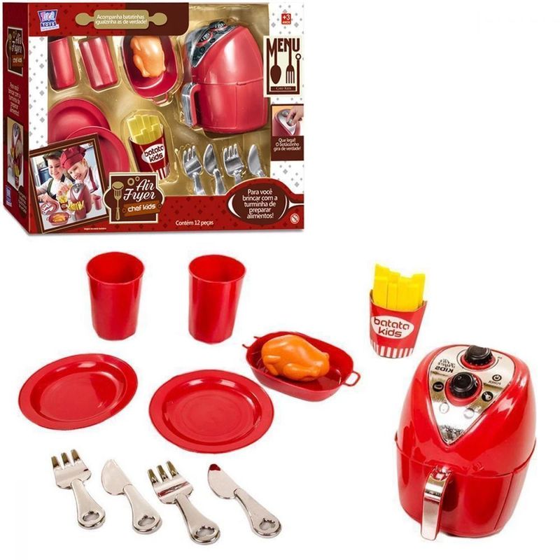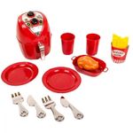 Kit com air fryer, assadeira, alimento, batata, pratos, copos e talheres. Os pequenos vão adorar brincar de chef de cozinha!