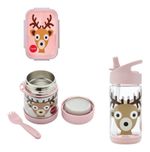 Kit Alimentação 3 SPROUTS ALCE (bento, pote térmico e garrafinha) O kit contem: - Bento Box é o pote imperdível da 3 Sprouts. Design retangular, possui 3 divisórias internas para alimentos diferentes, tampa transparente e travas laterais. - A garrafinha flip da 3 Sprouts é uma linha tipo squeeze que incrível para os pequenos. É feita de tritan (livre de BPA e BPS) que é um material bem resistente a quedas não pega odor, sabor e mancha. O bico é de borracha termoplástica e a base de polipropileno. Internamente possui canudo e vedação de silicone para evitar vazamentos. Tamanho: 17 cm x 6 cm de diâmetro Capacidade: 354 m- Pote Térmico Inox com Talher 3 Sprouts Alce. Mantém os alimentos quentes ou frios, por mais tempo, sendo de 4 à 6 horas.