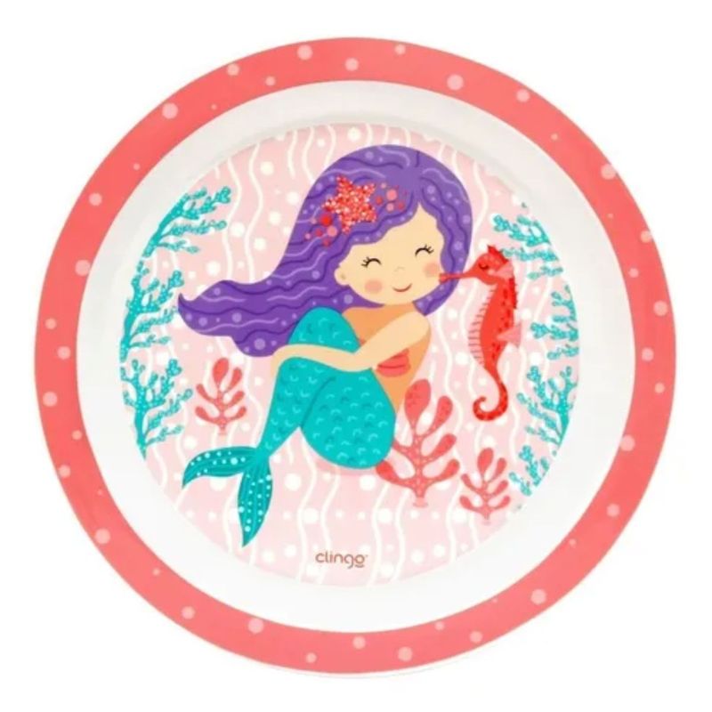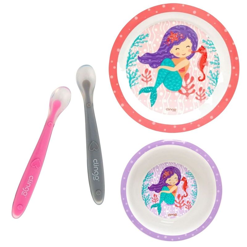 Kit Alimentação Sereia Clingo Rosa e Lilás Com 4 Itens Mod 2 - Composta por: Prato Raso, Tigela Bowl e 2 Colheres Silicone Premium