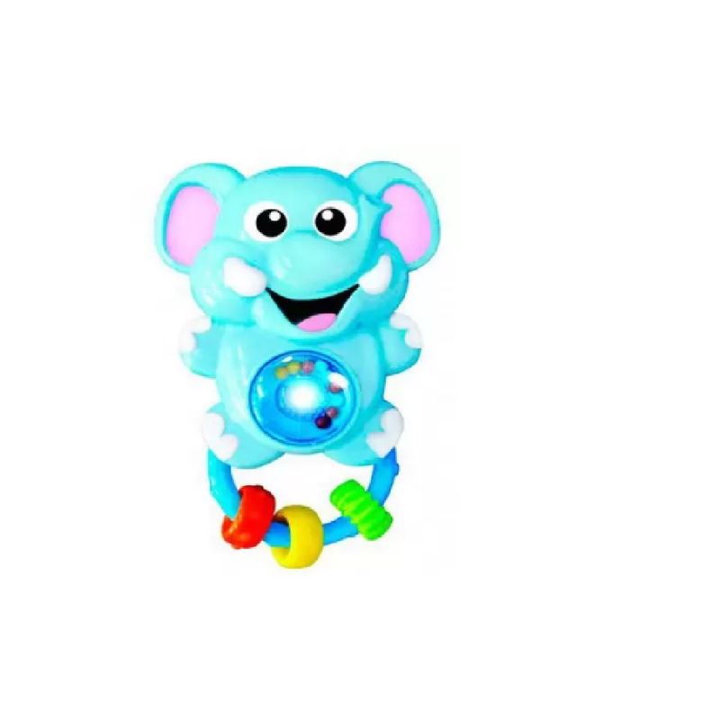 Ao movimentar a argola azul acenderão luzes na barriga acompanhando os sons emitidos São sete sons diferentes que tocam quando a alça é movimentada Possuem bolinhas e pequenas argolas que se mexem e fazem barulho conforme o bebê brinca com o chocalho.
