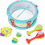 Com tambor, baquetas, pandeiro, maracas e castanholas, é ideal para desenvolver a coordenação motora e os sentidos do pequeno, além de estimular o primeiro contato com instrumentos musicais.