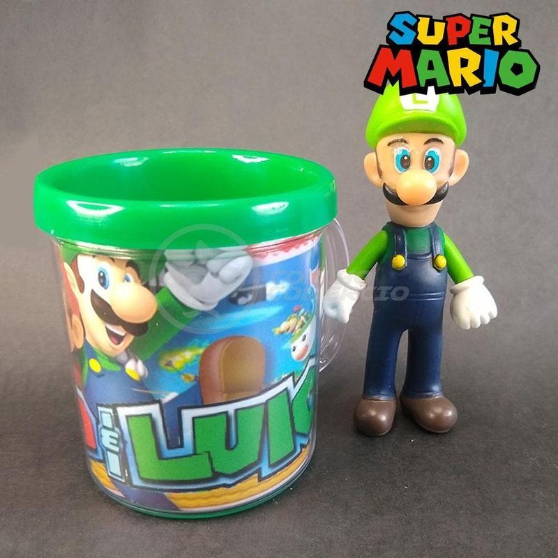 Kit Conjunto Boneco Colecionável Luigi Articulado Super Mario 13cm + Caneca Personalizada 350ml