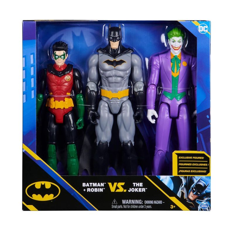Kit c/ 3 Bonecos Articulados 29cm - Batman e Robin vs The Joker Reviva as batalhas mais épicas de Gotham com este incrível set de figuras de ação exclusivas da DC Comics! O pack vem com Batman, Robin e o Coringa, prontos para horas de diversão e aventuras heroicas. Destaques do produto: Inclui 3 figuras articuladas: Batman, Robin e Coringa. Design detalhado inspirado nos personagens clássicos da DC. Capas em tecido nos heróis para deixar as brincadeiras ainda mais reais. Ideal para recriar batalhas entre heróis e vilões ou colecionar. Recomendado para crianças a partir de 3 anos. Junte-se a Batman e Robin para derrotar o maior inimigo de Gotham, o Coringa, e crie suas próprias histórias cheias de ação e aventura! Fabricante: Spin Master. Coleção: DC Comics Tamanhos:  - Coringa - 29 cm - Batman - 30 cm - Robin - 27 cm