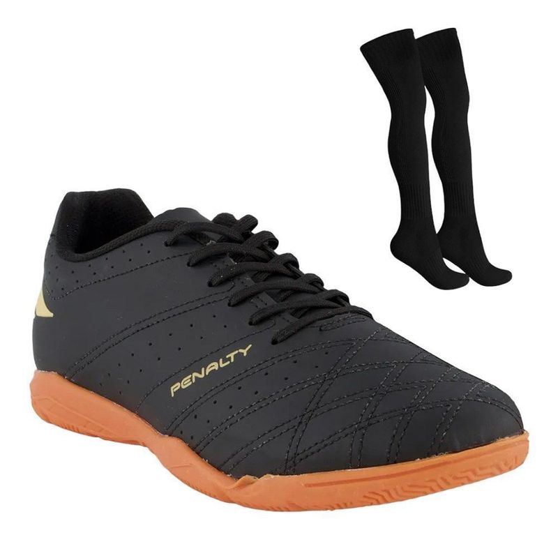 Pratique seu esporte preferido e melhore sua performance nas quadras com mais conforto e qualidade usando a chuteira Futsal Penalty Américas XXI. O cabedal desenvolvido em material sintético oferece mais resistência ao produto. Conta com fechamento em cadarço, lingueta flexível e forro acolchoado que entrega bem-estar durante o uso. O modelo fornece a tecnologia HiperFlex, que são canaletas posicionadas estrategicamente que auxiliam na flexão e movimento dos pés e o sistema Non-Marking, uma borracha que não marca as quadras e proporciona excelente tração. O solado em borracha que garante mais aderência, traz pontos de giro que facilita a movimentação nos dribles. O design vem em cor preta e traz a logo da marca Penalty em dourado na parte traseira e na lateral da chuteira. Já o meião, é confeccionado em materiais resistentes e traz a tecnologia Flot que proporciona maior ventilação, aumentando a respirabilidade. Seu tecido é um isolante térmico e conta com faixa tensora nos tornozelos para mais proteção. Referência: 124220.9040.