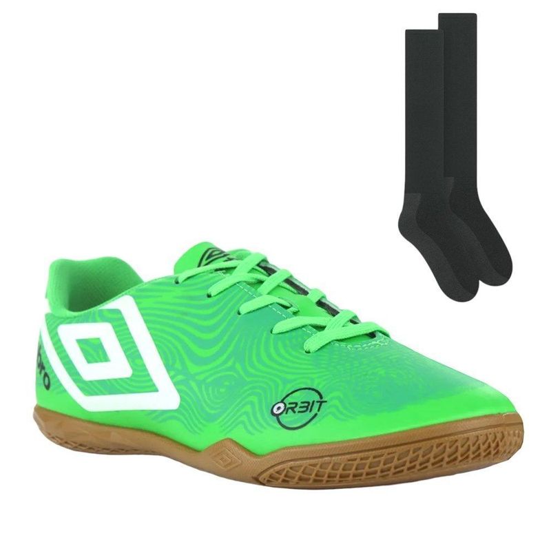 A Chuteira Futsal Umbro Orbit é a escolha perfeita para jogadores de futsal que buscam conforto, desempenho e estilo durante as partidas. Seu cabedal em material sintético proporciona durabilidade e resistência, garantindo uma longa vida útil à chuteira. A amarração por cadarço permite um ajuste personalizado, entregando firmeza e segurança nos pés. A lingueta flexível fornece um encaixe suave e confortável, evitando desconfortos durante os movimentos. A palmilha em EVA dispõe de amortecimento e bem estar, absorvendo impactos e garantindo uma pisada mais suave. O interior forrado e acolchoado da Chuteira concede um toque suave e agradável à pele, garantindo conforto e evitando atritos indesejados. O solado emborrachado com tecnologias Non-Marking e 360º Zone oferece tração excepcional e aderência em quadras de futsal, permitindo movimentos precisos e ágeis. A tecnologia Non-Marking também evita deixar marcas nas superfícies, ideal para uso em ambientes internos. Seja para treinos intensos ou para partidas emocionantes, a Chuteira Futsal Umbro Orbit é a escolha ideal para jogadores que buscam uma chuteira de qualidade para uma melhor performance nas quadras. Já o meião de futebol é ideal para quem quer completar seu uniforme para suas partidas. Este meião foi produzido em um tecido especial de poliamida com poliéster e elastano, por isso, ele é perfeito para quem busca uma peça elástica e ao mesmo tempo extremamente leve e muito confortável. Seu design traz uma única cor, possibilitando assim, uma maior versatilidade ao montar seus uniformes. Referência da Chuteira: U01FB00152-521. Medida Aproximada meião (cm): 39-43: 22x44x10 (Comprimento do Pé x Altura do Cano x Largura do Cano).