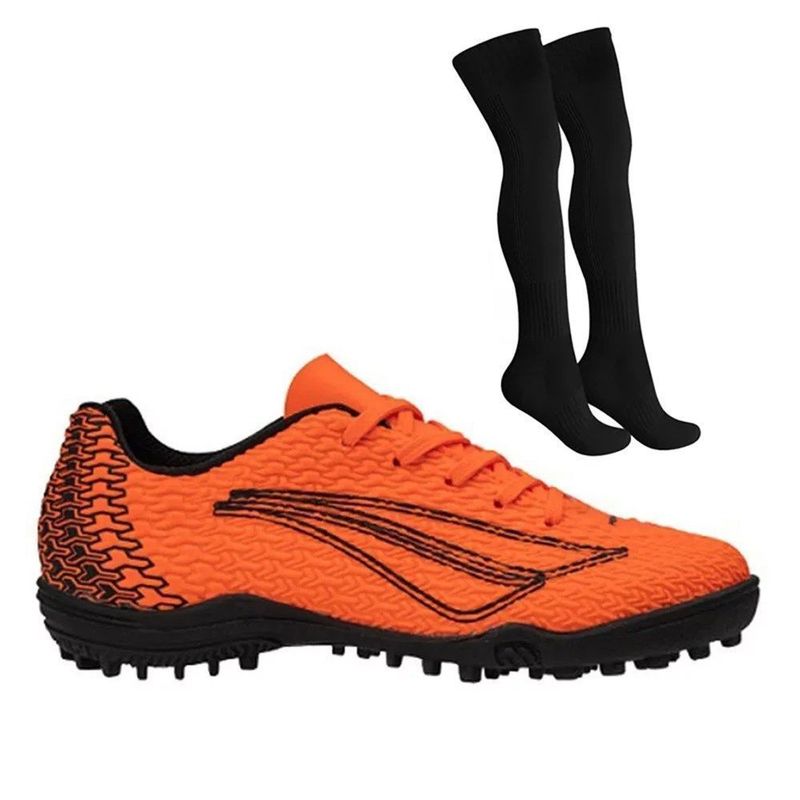 Com o kit Chuteira Society Penalty Bravo Kids XXII + meião, os jovens craques terão um melhor desempenho durante os jogos. Indicada para campos de grama sintética, essa chuteira possui cabedal confeccionado em material sintético texturizado, que oferece melhor controle e precisão com a bola nos pés. Possui forro interno com acolchoamento reforçado na região do calcanhar para maior proteção, além de palmilha feita em EVA, forrada e removível. O modelo traz a tecnologia HiperFlex, canaletas posicionadas estrategicamente que auxiliam na flexão e movimento dos pés. O solado de borracha dispõe também do sistema Rotate, pontos de giro que ajudam a prevenir lesões durante as partidas. O design vem cores vivas com detalhes da marca em preto. Referência: 246246.33. Já o meião é fabricado em fibras têxteis de alta qualidade, proporcionando maior conforto e elasticidade. Conta com faixa tensora para melhor ajuste, além de entregar secagem rápida. Modelo indicado para o uso entre os tamanhos 33 a 38. Referência: 411651.