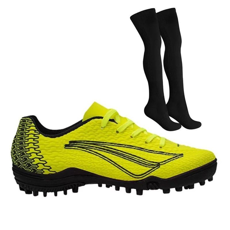 Com o kit Chuteira Society Penalty Bravo Kids XXII + meião, os jovens craques terão um melhor desempenho durante os jogos. Indicada para campos de grama sintética, essa chuteira possui cabedal confeccionado em material sintético texturizado, que oferece melhor controle e precisão com a bola nos pés. Possui forro interno com acolchoamento reforçado na região do calcanhar para maior proteção, além de palmilha feita em EVA, forrada e removível. O modelo traz a tecnologia HiperFlex, canaletas posicionadas estrategicamente que auxiliam na flexão e movimento dos pés. O solado de borracha dispõe também do sistema Rotate, pontos de giro que ajudam a prevenir lesões durante as partidas. O design vem cores vivas com detalhes da marca em preto. Referência: 246246.33. Já o meião é fabricado em fibras têxteis de alta qualidade, proporcionando maior conforto e elasticidade. Conta com faixa tensora para melhor ajuste, além de entregar secagem rápida. Modelo indicado para o uso entre os tamanhos 33 a 38. Referência: 411651.