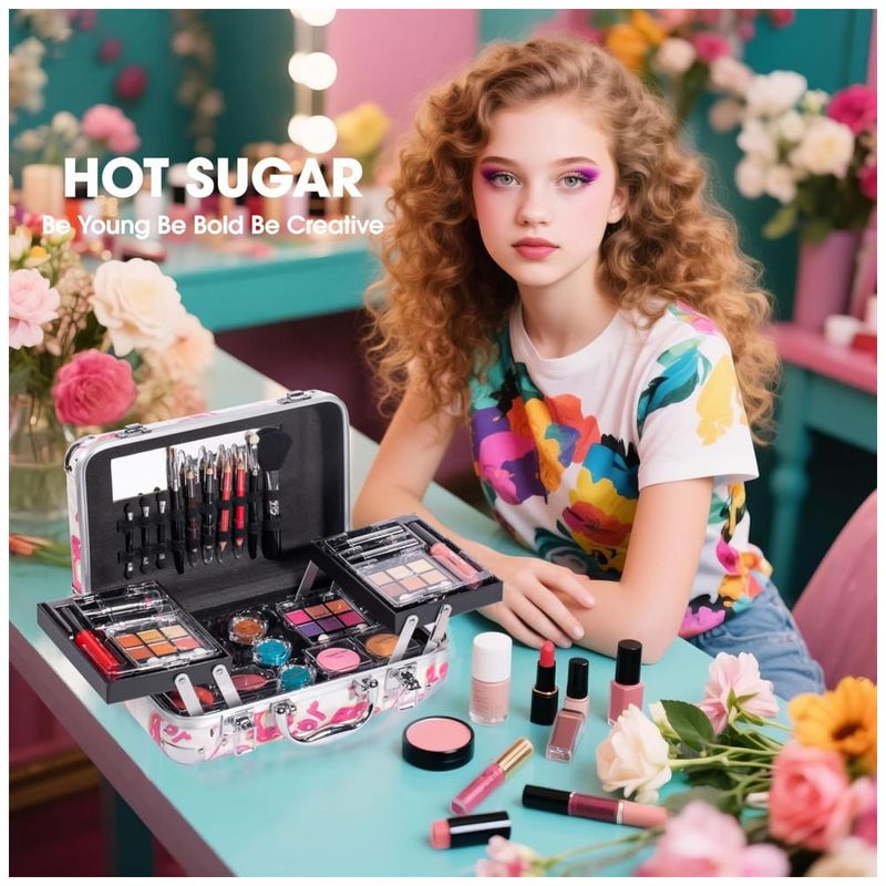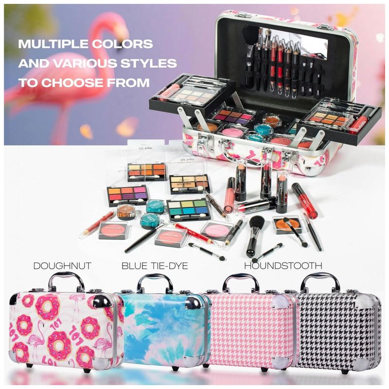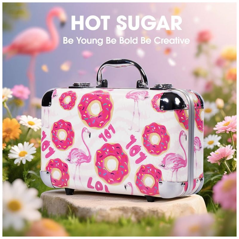Inclui 27 sombras para olhos em paleta com tons quentes e frios, acabamentos matte e shimmer para combinações cromáticas versáteis, além de 4 blushes em minipaletas, 2 gloss labiais, 4 batons, 10 pincéis para aplicação precisa, 2 lápis labiais e 2 lápis para olhos. O estojo rígido apresenta padrão decorativo em donut, espelho embutido e capacidade para organizar cosméticos, ferramentas, joias e relógios, fabricado pela Hot Sugar com ênfase em portabilidade e durabilidade.