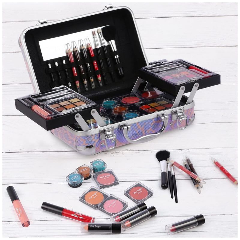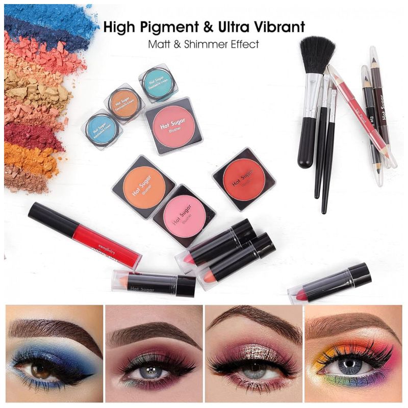 Contém 27 sombras para olhos em paleta com tons quentes e frios, matte e shimmer para combinações cromáticas variadas, 4 blushes em minipaletas, 2 gloss labiais, 4 batons, 10 pincéis para aplicação precisa, 2 lápis labiais e 2 lápis para olhos. Fabricado pela Hot Sugar, prioriza modularidade e portabilidade técnica em embalagem rígida para durabilidade.