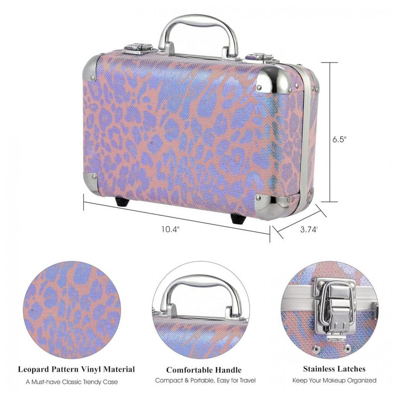 Design: Estojo rígido com alça superior, padrão leopardo rosa, modular para itens removíveis