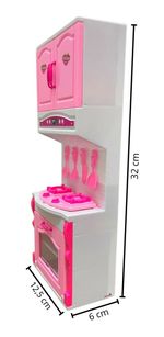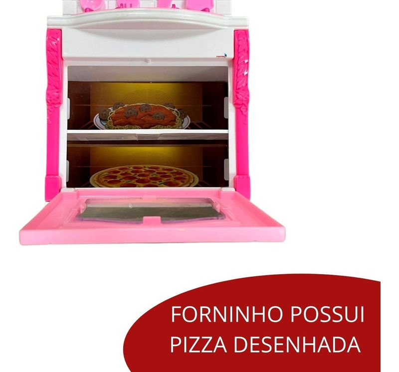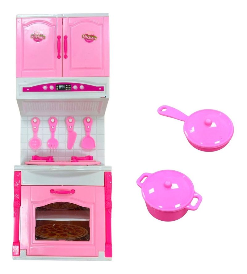 Ela vem toda equipada com tudo que uma cozinha de verdade tem: fogão, pia e forno, além de acompanhar panelas com tampa e talhes, ela também possui luzes e som.