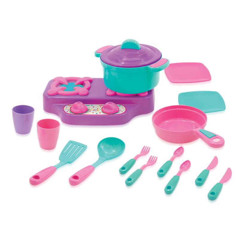 Itens inclusos: 1 fogão, 1 panela com tampa, 1 frigideira, 2 copos, 2 pratos, 2 facas, 2 colheres, 2 garfos, 1 concha e 1 espátula.