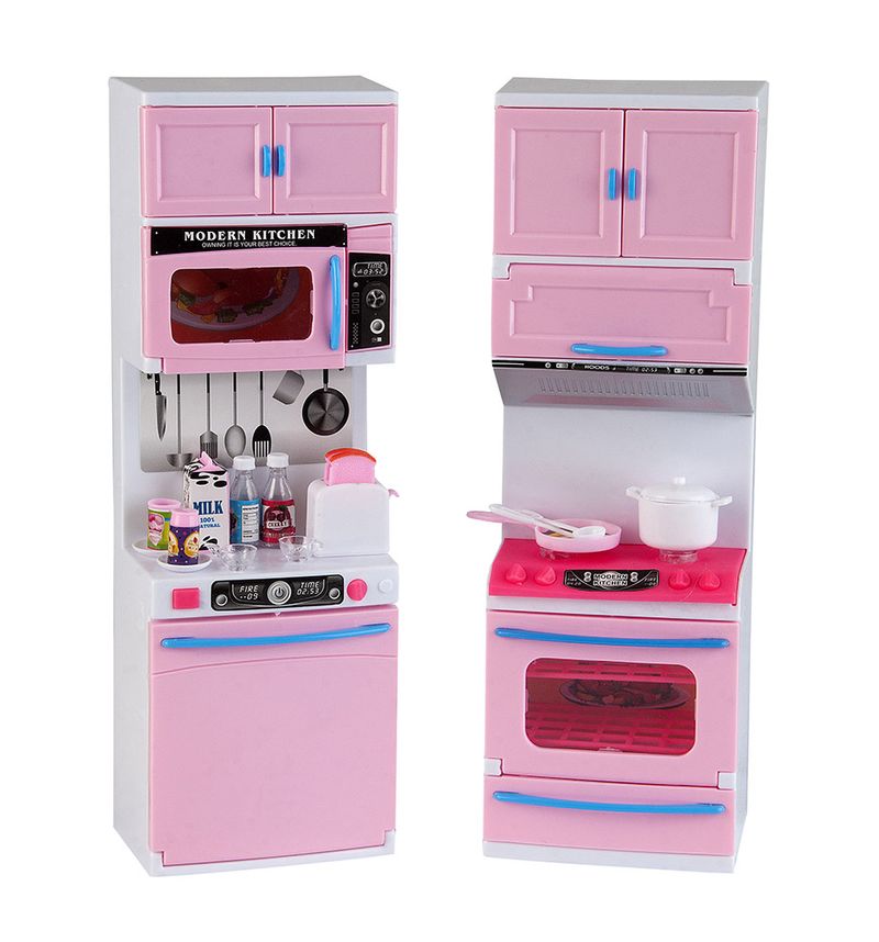 O Kit vem com armários cheios de acessórios como taças, bebidas, xícaras, alimentos e utensílios domésticos, fogão e micro-ondas embutidos.