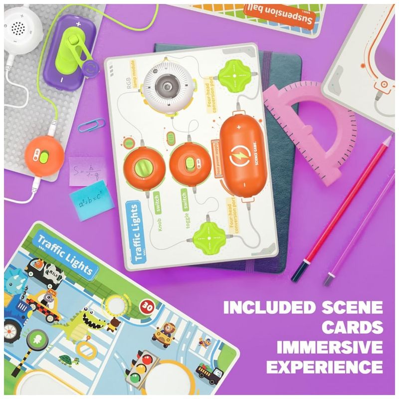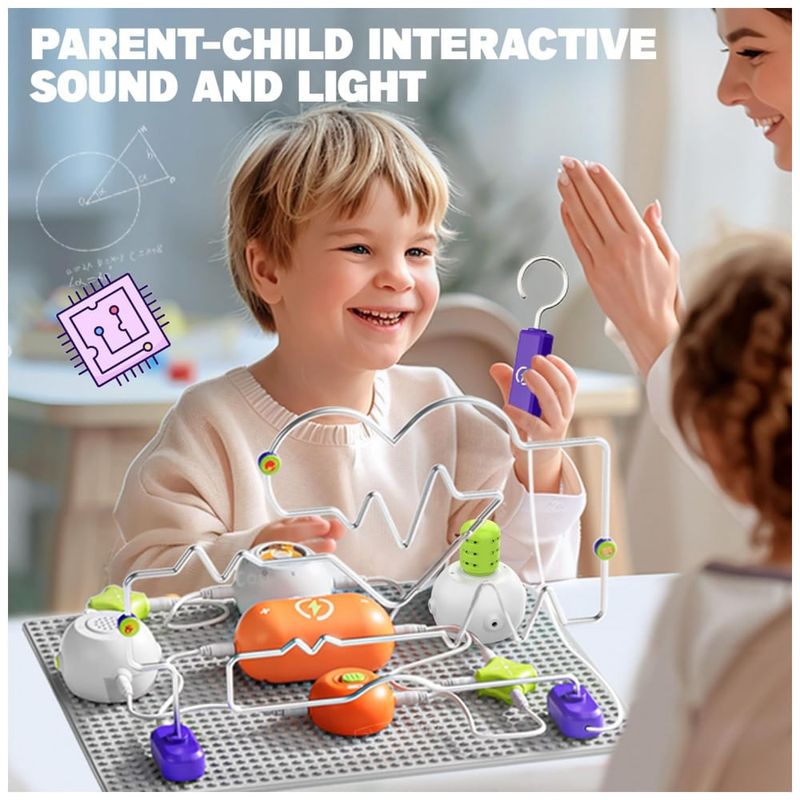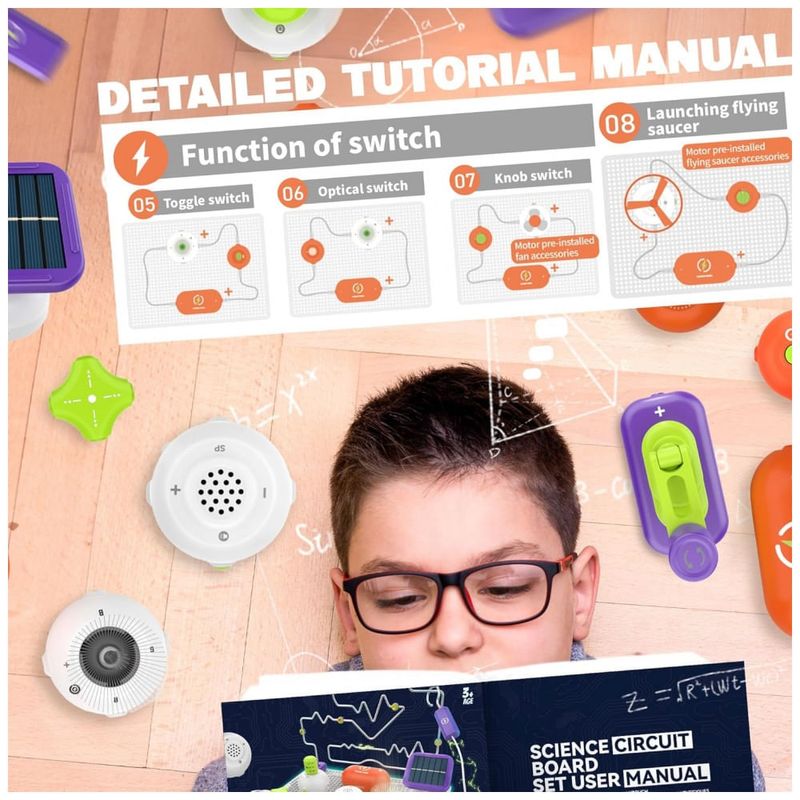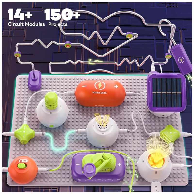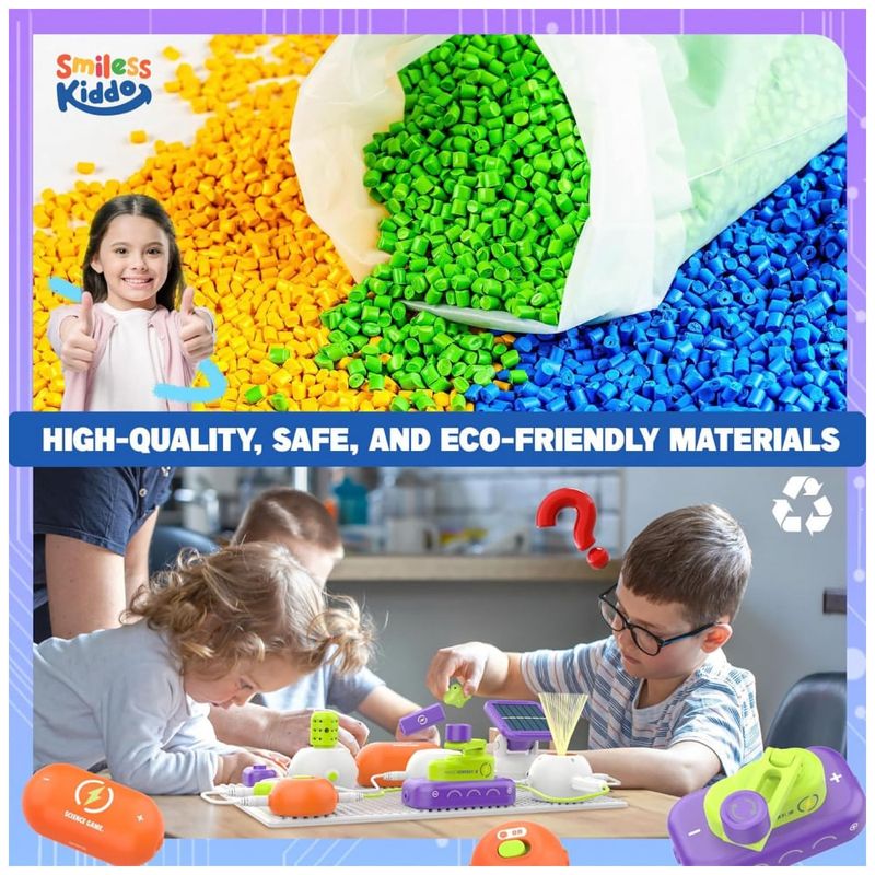 O kit de ciências SMILESSKIDDO RC1008A é um conjunto introdutório de eletrônica com mais de 150 projetos possíveis, voltado para crianças de aproximadamente 5 a 12 anos, com base de circuitos de encaixe (snap). Ele usa cerca de 14 módulos de circuito — incluindo labirinto de circuito, módulo de spray, módulo de luz RGB, hélice tipo “disco voador”, chaves e conectores — montados sobre uma placa plástica sem necessidade de solda, permitindo explorar ligações em série e paralelo de forma segura.