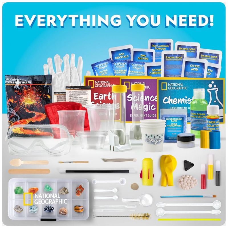 MAIS DE 130 EXPERIMENTOS EMPOLGANTES! Este kit contém 45 dos nossos experimentos mais populares de ciências da Terra, química e mágica, juntamente com um guia bônus repleto de 85 experimentos adicionais usando itens comuns do dia a dia. EXPLORE AS CIÊNCIAS DA TERRA! As crianças construirão e farão um vulcão entrar em erupção, cultivarão um cristal que brilha no escuro, criarão tornados de água e desenterrarão um fóssil real! Elas também receberão uma incrível seleção de rochas, minerais e cristais reais para a sua coleção. ADENTRE NA QUÍMICA! O conjunto de química deste kit possui tudo o que as crianças precisam para fazer minhocas viscosas e ovos de minhoca, criar reações borbulhantes, lançar um foguete com gás, fazer fogos de artifício de cristal que estouram e muito mais. EXPERIMENTE A MAGIA DA CIÊNCIA! Este kit também possui uma variedade de experimentos científicos que funcionam como truques de mágica. Algumas das mágicas científicas que as crianças aprenderão incluem mudar a cor da água, pegar bolhas nas mãos e fazer moedas flutuarem! PRODUTOS VENCEDORES DE PRÊMIOS! Blue Marble, vencedora do prestigioso prêmio Toy of the Year Award da Toy Association, desenvolve orgulhosamente produtos que incentivam a educação, imaginação e criatividade.