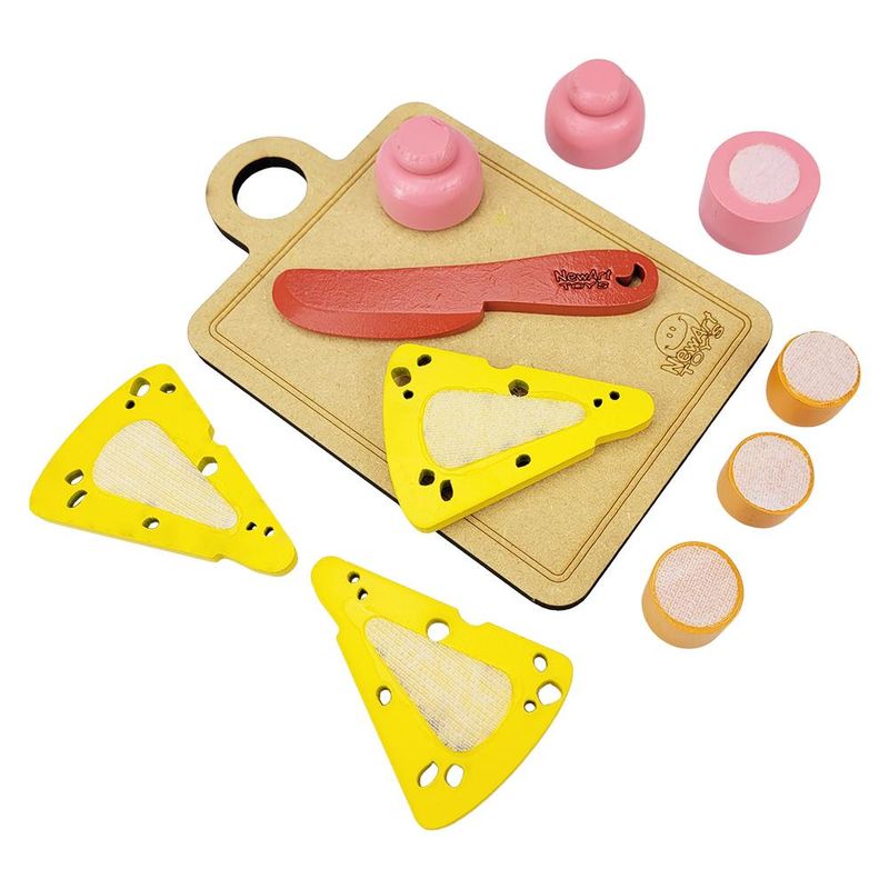 O Kit de Comidinha de Brinquedo Frios com Velcro modelo 393 da NewArt, acompanha 3 frios de brinquedo com velcro sendo 1 queijo, 1 salame e 1 salsicha além 1 tábua para cortá-los e 1 faca de brinquedo, todos acondicionados uma embalagem de plástico termoencolhível.