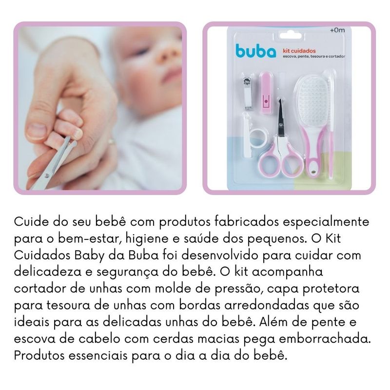 Cuide do seu bebê com produtos fabricados especialmente para o bem-estar, higiene e saúde dos pequenos. O Kit Cuidados Baby da Buba foi desenvolvido para cuidar com delicadeza e segurança do bebê. O kit acompanha cortador de unhas com molde de pressão, capa protetora para tesoura de unhas com bordas arredondadas que são ideais para as delicadas unhas do bebê. Além de pente e escova de cabelo com cerdas macias pega emborrachada. Produtos essenciais para o dia a dia do bebê.