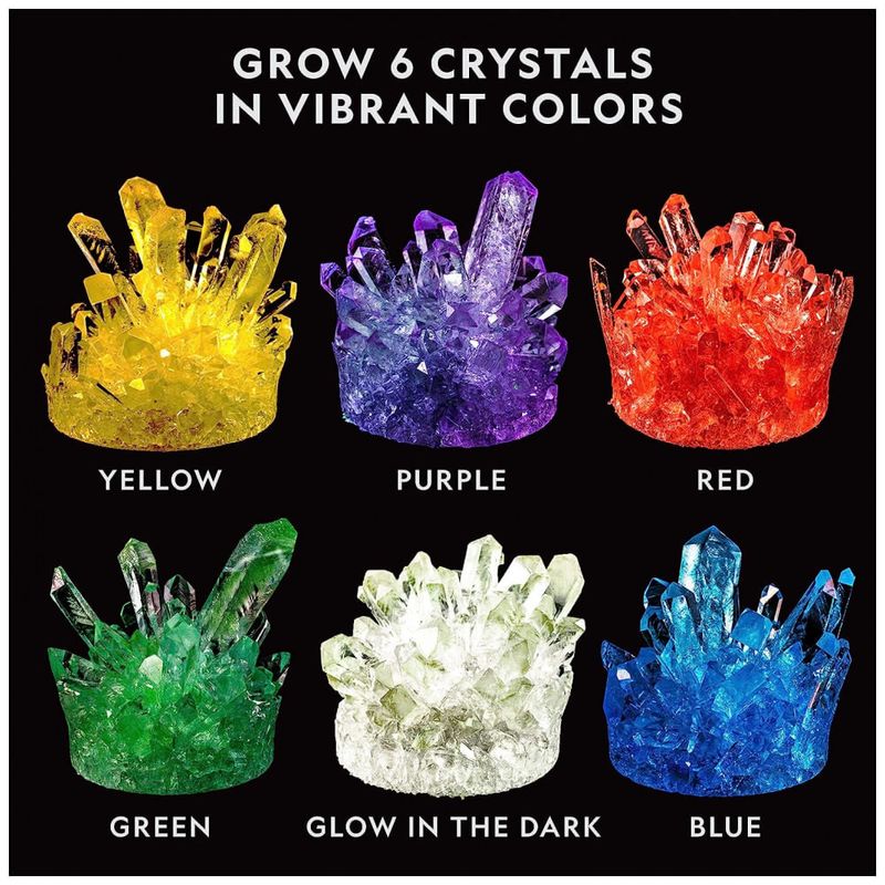 CRISTAIS DE CRESCIMENTO RÁPIDO EM 6 CORES Vermelho, verde, azul, roxo, amarelo e brilham no escuro, a química dos cristais nunca foi tão rápida cresce em 3 a 4 dias, divertida e colorida O presente educacional perfeito para meninos e meninas
