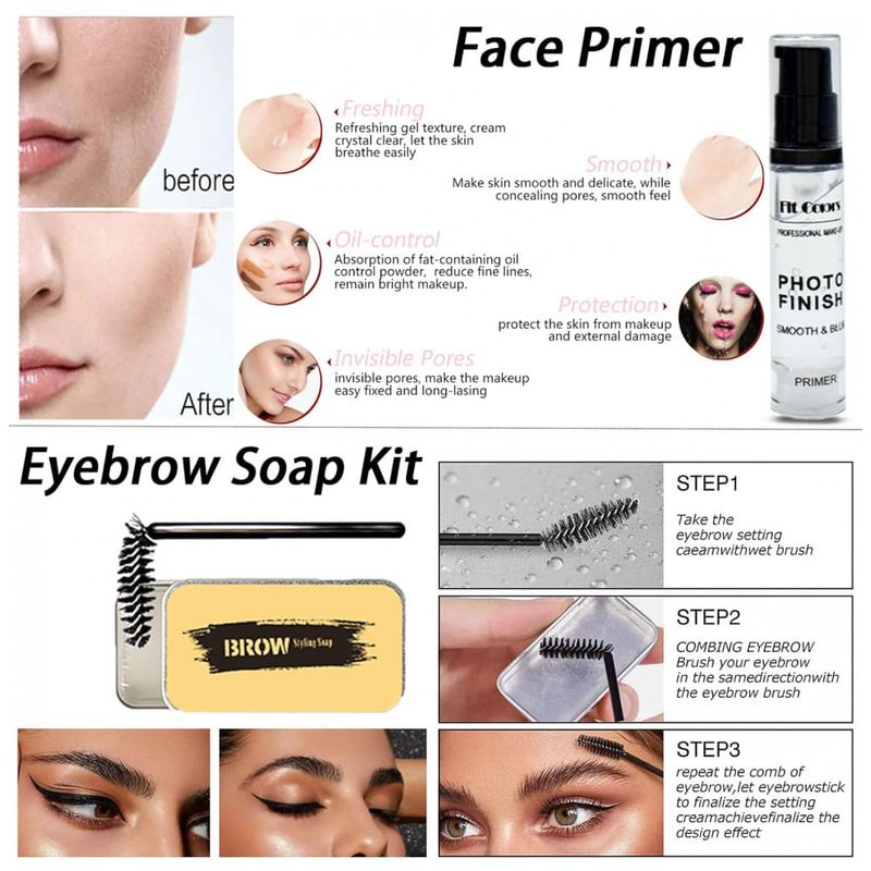O Kit de Maquiagem Completo Tudo em Um Geyomi inclui paleta de 12 cores de sombra matte, base nude e bege buff, primer facial, conjunto de batons líquidos, delineador stamp alado, máscara para cílios, bastão de contorno, sabão para sobrancelhas, pincel de maquiagem e 2 esponjas. As fórmulas apresentam alta pigmentação, textura em pó e líquido, com resistência à água, extensibilidade otimizada e acabamento fosco para cobertura total.