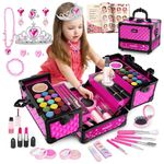 Brinquedos de maquiagem de segurança de material: O kit de maquiagem infantil é feito de material de alta qualidade, durável e renovável que atende aos padrões de brinquedos infantis internacionais (certificados CPSIA, CPC, ASTM) para segurança e foi testado no corpo, pode haver uma fragrância leve e inofensiva quando a caixa de maquiagem acaba de ser aberta, mas pode ser usada com confiança. Fácil de lavar com água e sabão, não deixa manchas na pele, roupas ou móveis. Amigável para as crianças se maquiarem.