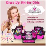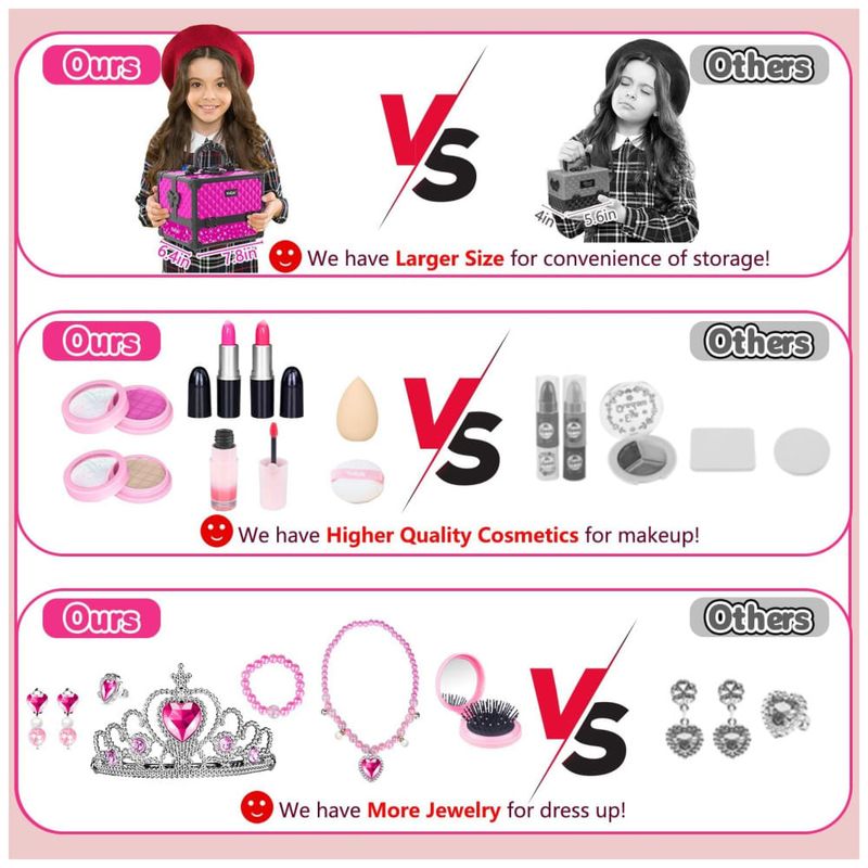 Estojo de maquiagem de tamanho grande e sem bagunça: O tamanho da caixa de maquiagem é 19 x 16 x 16 centímetros. Quando totalmente aberto, o comprimento é de 36 centímetros! Incluindo um total de 65 unidades de cosméticos e acessórios. Coroa e joias são as preferidas de toda princesa! Desde fantasias, festas e atividades, ou apenas a hora da princesa, há muitos utensílios de maquiagem nesta caixa de maquiagem com alça.