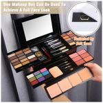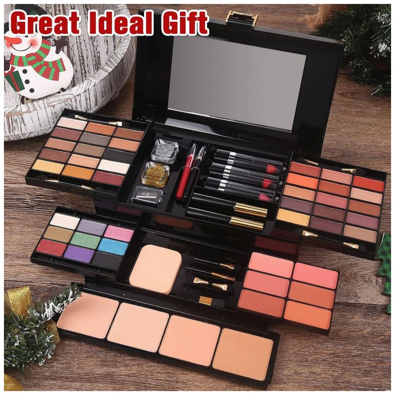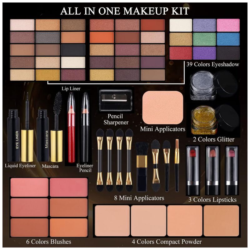 Este kit de maquiagem profissional completo da MORNECA oferece uma solução tudo-em-um com 58 itens essenciais para diversas aplicações de maquiagem. Inclui 39 sombras matte e shimmer, 6 blushers, 4 pós compactos, 3 batons, 2 glitters, 1 delineador líquido, 1 máscara, 1 lápis delineador, 1 contorno labial, 1 apontador de lápis e 9 aplicadores mini, além de espelho integrado. A composição permite criar looks variados com tons frios e quentes, incluindo acabamentos matte, metálicos, satinados, shimmers e glitter em gel.