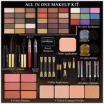 Composição do Kit 39 sombras (matte e shimmer), 6 blushers, 4 pós compactos, 3 batons, 2 glitters, 1 delineador líquido, 1 máscara, 1 lápis delineador, 1 contorno labial, 1 apontador de lápis, 9 aplicadores mini, espelho integrado (total: 58 itens)