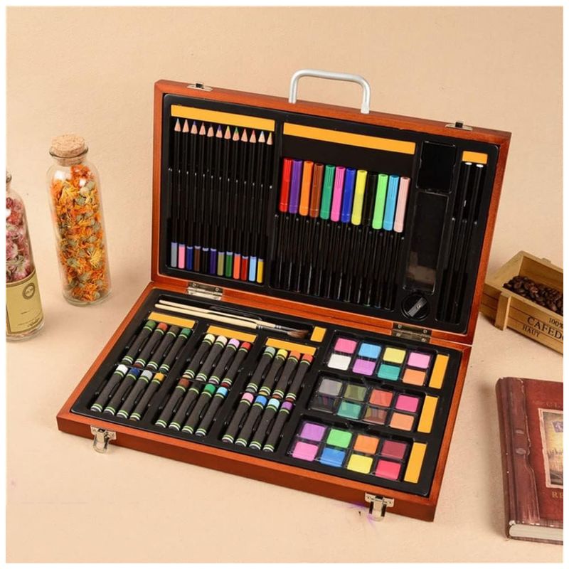 Tamanho da caixa 22,7 x 37,2 x 4,, conjunto de arte de luxo com 82 peças. Componentes pastéis de óleo, giz de cera, canetas aquarela, pó aquarela, pincéis, ferramentas auxiliares.
