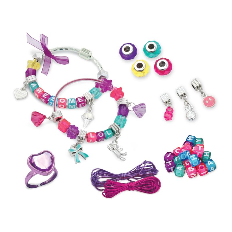 Perfeita para quem ama brilhar, esta coleção vem repleta de tudo o que você precisa para criar acessórios únicos e personalizados. Com 2 pulseiras, 50 berloques, 100 contas de letras do alfabeto, um tubo brilhante, além de cordões elásticos e fitas, as possibilidades são infinitas!