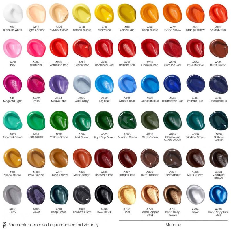 Seleção emocionante de cores de qualidade artística seja você na pintura acrílica ou um artista experiente, cores como Amarelo Limão, Azul Phthalo e Vermelho Carmesim irão incendiar sua imaginação.