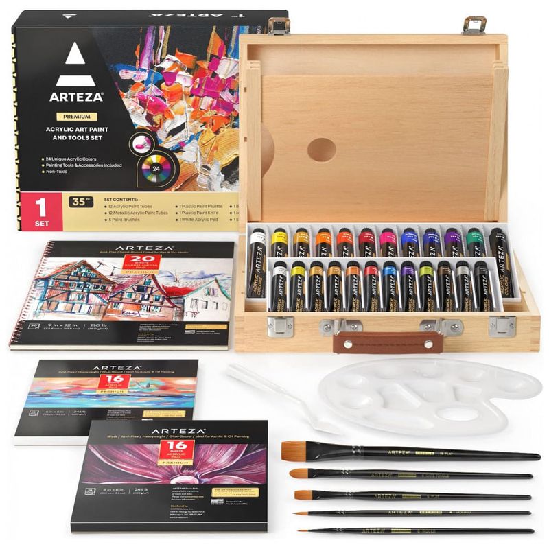 O conjunto completo de pintura acrílica projetamos este conjunto de acrílico para que os artistas tenham tudo o que precisam para começar a criar. Este conjunto de pintura acrílica inclui uma caixa de arte e ferramentas de arte, como pincéis, uma paleta de pintura e faca e 24 tintas.