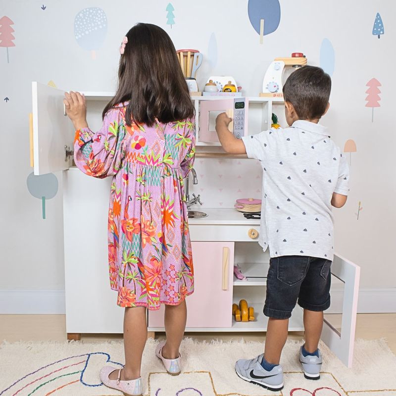 DESIGN LÚDICO E REALISTA: cooktop com botões giratórios, pia com torneira, portas que abrem e fecham; micro-ondas e forno com visor.