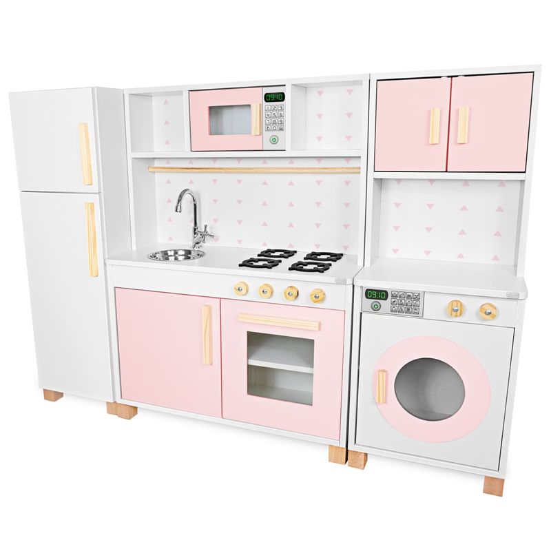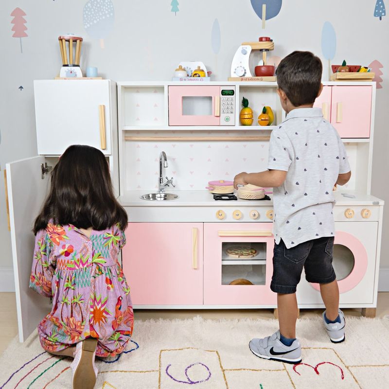 DESIGN LÚDICO E REALISTA: cooktop com botões que giram, pia com torneira, micro-ondas e forno com visualização interna, portas funcionais e armário com ótimo espaço.